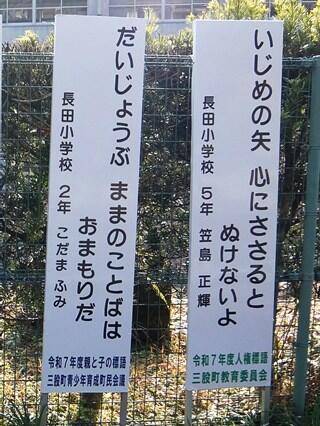 令和7年度の「三股町人権標語」と「三股町親子ふれあい標語」の首相作品のパネルが、正門横に設置されました。お近くをお通りの際はご覧ください。