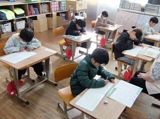 4年生は、国語の復習プリントに取り組んでいました。これまでに経験が少ない、問題文と回答欄が異なるページにある問題に取り組んでいました。