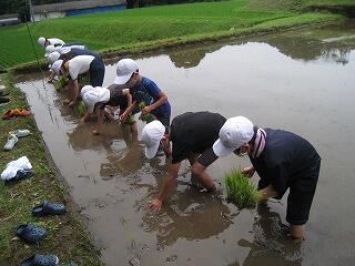 子どもたちは、田んぼのぬかるみに最初は悪戦苦闘しながらも、少しずつ慣れてくると、上手に植えることができました。秋の稲刈り、そして収穫が楽しみです。