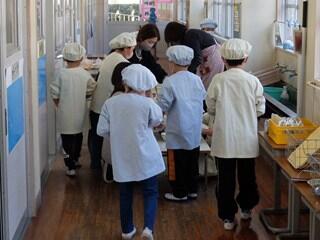 給食の準備は、1階(1~3年生)、2階(4~6年生)でそれぞれ準備をします。3学期から、1年生も交代交代に当番をしています。
