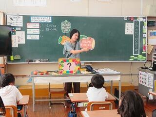 10/1(火)の3校時に1年生が食育の授業を受けました。「野菜となかよし」になって、好き嫌いをせずに食べると体が元気になることについて学習しました。ペアになって野菜が苦手な場合でも食べることができる方法について話し合いもしました。好き嫌いを少なくして、元気いっぱいに成長してくれることでしょう。