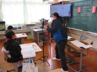 下の5年生学級では、コロナ関連で登校できない児童が家庭からオンラインで参加し、算数「立体の見取り図」の学習が行われていました。