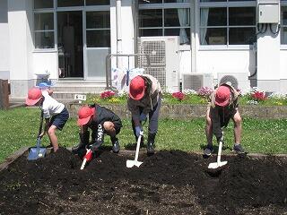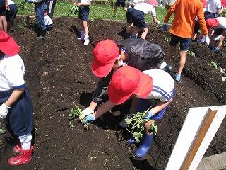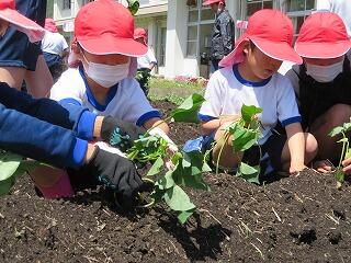 5月8日(月)はさつまいもの苗植えを行いました。5・6年生は、事前に全校のみんなが植えやすいように畝づくりをするところからスタートしました。苗植えでは、植えるときに上級生が下学年のお世話をするなど、活躍しました。植え終わった後には、班ごとに今後のお世話をどうするかを決めました。全校でおいしいさつまいもが収穫できるように、お世話していきます。
