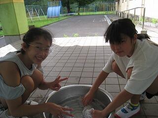 今週の木曜日は、家庭科の学習で手洗いでの洗たくを行いました。学習する中で、ふだん使っている洗たく機がどうやってよごれを落としているのかを考えながら、洗ざいを使った洗たく、すすぎ、脱水(ねじりしぼり)、しわをのばして干す、というところまで順序を考えながら体験しました。子どもたちからは、1枚1枚手洗いをするのは大変だという感想が出てきて、普段使っている洗たく機のありがたみも分かったようでした。みんなががんばって手洗いをすることができました。