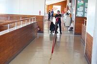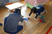 3日(水)に、3年生は総合的な学習の時間に福祉体験学習を行いました。子どもたちは、アイマスクを付けたり、杖を使ったりして、友だちに声掛けしてもらいながら廊下をゆっくりと歩いていました。