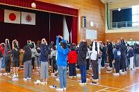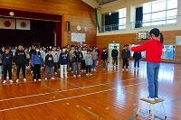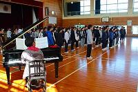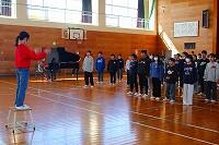 また、6年生は、体育館に集まって4クラス合同での音楽の授業でした。ウォーミングアップや発声練習の後、卒業式で歌う曲「流れゆく雲を見つめて」の練習をしていました。
