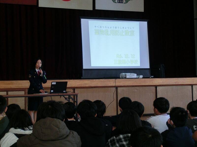 12月1日(月)に、6年生で薬物乱用防止教室を行いました。都城警察署生活安全課の方から、薬物の体に及ぼす影響や依存性など薬物乱用の恐ろしさについて、分かりやすく教えていただきました。