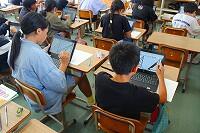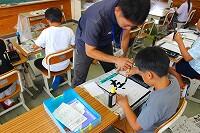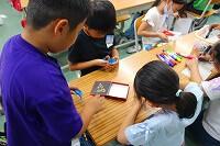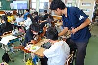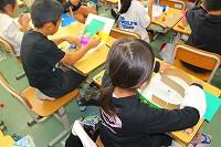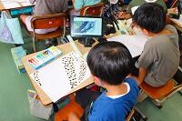 子どもたちは、三股町内にある学校や公園など、自分たちでテーマを決めて、タブレットや副読本を使って調べていました。