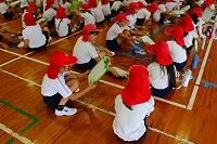 28日(木)の3校時に地震発生を想定した避難訓練を行いました。子どもたちは、地震発生を知らせる放送が流れると、帽子をかぶり、机の下にもぐって、机の脚をしっかりと握っていました。そして、揺れがおさまり、先生の指示で運動場へ無言で移動するなど、みんな真剣に取り組んでいました。