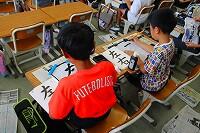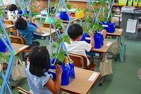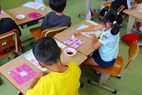 15日(火)に、1年生は生活科の時間にあさがおの花で作った色水で絵を描いたり、和紙を折って色水に付けたりしていました。和紙は折り方によって広げたときの模様が異なるため、子どもたちはどんな模様になっているか、ワクワクしながら慎重に広げていました。