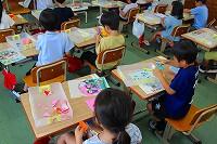 18日(木)に、1年生は図工の時間に切り絵で海の生き物を作る活動に取り組んでいました。子どもたちは、自分でローラーを転がして様々な模様を描いた画用紙を、はさみで切って「かに」や「いか」などを作り、青色の画用紙に貼って作品を仕上げていました。