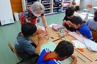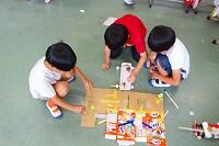 子どもたちは、少し厚手の紙で動物や星などの形を作り、その中にセロハンやストローを入れて、トレーシングペーパーを貼り付けていました。子どもたちは、形や色を上手に組み合わせて、蛍光灯の光に照らして確認しながら、思い思いの作品を仕上げていました。