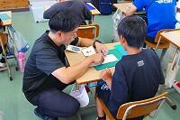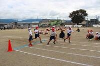 3年生は、腰に赤や黄、緑色などのタグを付けて、色で鬼を決めた後、鬼につかまらないように決められた区間を走りきる活動に取り組んでいました。何回か行ううちに、子どもたちは、つかまえる、にげるコツをつかんだようで、気付いたことを発表し合っていました。