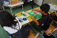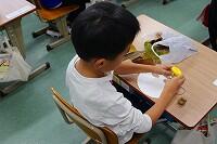 色の着いた液体粘土が完成すると、子どもたちは、手や指を使って画用紙に絵を描きながら、その感触を楽しんでいるようでした。子どもたちは、色の混ぜ方、手や指の動かし方を工夫しながら作品を仕上げていました。