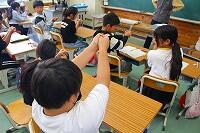 3日(水)に、3年生は総合的な学習の時間に福祉体験学習を行いました。子どもたちは、アイマスクを付けたり、杖を使ったりして、友だちに声掛けしてもらいながら廊下をゆっくりと歩いていました。