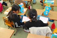 8日(月)に、1年生は図工の時間に作品を鑑賞し合っていました。子どもたちにとっては、初めてカッターナイフを使っての作品でしたが、自分で工夫した点を一人一台端末で入力したり、友だちの作品をみんなでじっくり鑑賞したりしていました。