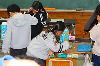 3日(水)に、3年生は総合的な学習の時間に福祉体験学習を行いました。子どもたちは、アイマスクを付けたり、杖を使ったりして、友だちに声掛けしてもらいながら廊下をゆっくりと歩いていました。