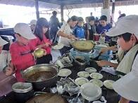いま、小雨が降っています。野外炊飯の説明が始まります。