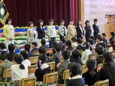 本校を転出・退職される先生方とのお別れの式「離任式」を行いました。本年度末は、校長先生を初めとする15名の職員が転出または退職することになりました。お別れの式で、子どもたちは、出て行かれる先生方の言葉をしっかりと受け止め、別れを惜しんでいました。転出・退職される先生方の新しいところでの活躍を祈り、全員で見送りをしました。
