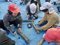 三股町林業研究会の協力と資材提供により、飼育・栽培委員会の5・6年生児童が、しいたけのコマ打ち体験をしました。研究会の方の説明を受け、子どもたちは、しいたけ栽培用の原木の穴に、椎茸の菌が付いたコマをハンマーで打ち込みました。しいたけができるのは、1年8か月後ということ聞き、子どもたちは収穫できることに胸を膨らませているようでした。