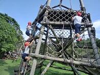 1日目はフィールドアスレチック、ナイトウォーキング、2日目は野外炊飯の活動を行いました。フィールドアスレチックでは、グループでいろいろなアスレチックに挑戦し、楽しい汗を流しました。野外炊飯では、班でかまどに火を起こしカレーライスを作りおいしくいただきました。