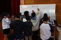 その後、子どもたちは、三股町で開催される「銃剣道」競技について調べて、ルールや歴史などホワイトボードに書き出しました。そして、その中からグループでキーワードを決めて、踊りで表現するために自分たちで振付を考えていました。