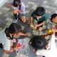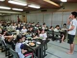132名、全員元気に昼食会場に着き、昼食をとっています。鹿児島は、雨があがり、穏やかな曇り空です。全員笑顔で、楽しく過ごしています。