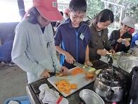 1日目はフィールドアスレチック、ナイトウォーキング、2日目は野外炊飯の活動を行いました。フィールドアスレチックでは、グループでいろいろなアスレチックに挑戦し、楽しい汗を流しました。野外炊飯では、班でかまどに火を起こしカレーライスを作りおいしくいただきました。