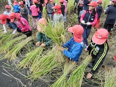6月に田植えをした稲が、台風の被害にもあわず順調に成長し、たくさんの穂が実りました。先日、5年生全員で稲刈りをしました。たくさんの実りに、子どもたちはとてもうれしそうでした。収穫したもち米は、11月の三股町よかもん市で販売する予定です。よしき農園の皆様、ありがとうございました。