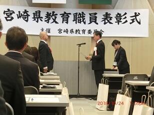 平成30年度宮崎県教育職員表彰式が行われ、本校の原圭史教諭が「教育功労者表彰」を受賞しました。県内で数名という大変名誉な表彰です。原先生の永年のICT教育の実践、研究論文、自校や他校での研修講師などの業績が認められたものです。本校にとってもたいへん名誉なことです。