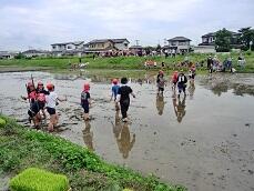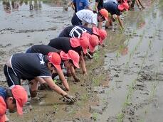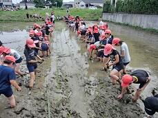 5年生は、よしき農園さんの水田で田植えを行いました。よしき農園の方や地域のボランティアの方々の指導、協力をいただき、昔ながらの手植えを体験することができました。水田の柔らかい土の感触に、5年生は大はしゃぎでした。この後、秋には稲刈りを行い、冬にはもちつきを行う予定です。ご指導くださった皆様、ありがとうございました。