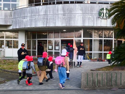 宮崎サンシャインズの選手4名が児童玄関の前に立ち、あいさつ運動を行いました。