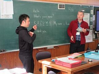 自分の名前を他の人に知らせる学習です。まず、ALTと担任の先生が手本を示します。