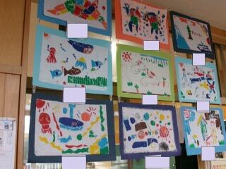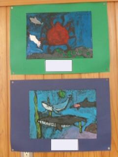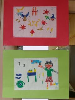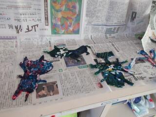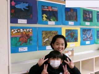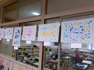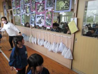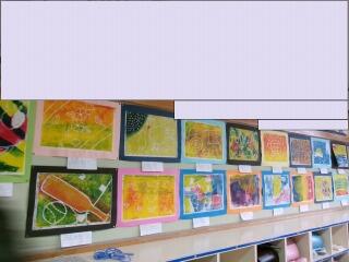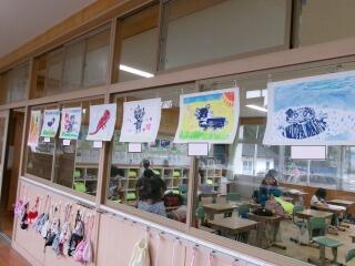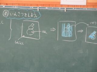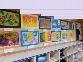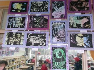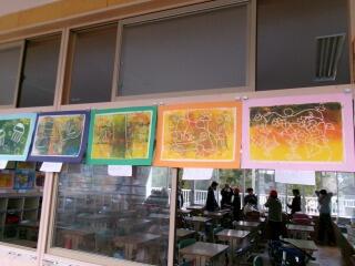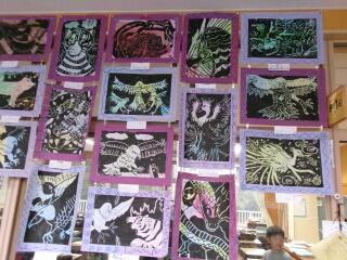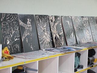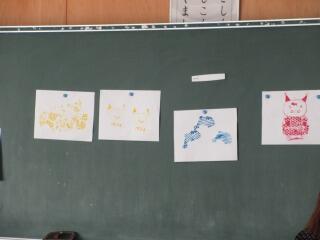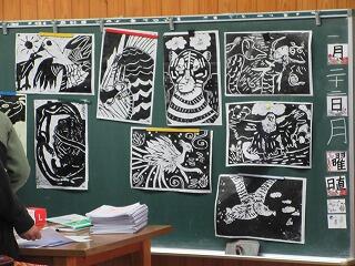 「彫り上がった版にインクを付けて刷り上がったばかり」という感じの、まだ乾ききっていない版画が数枚黒板や教室の後ろにあります。6年生の版画は、動物をモチーフにしているようです。