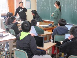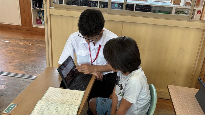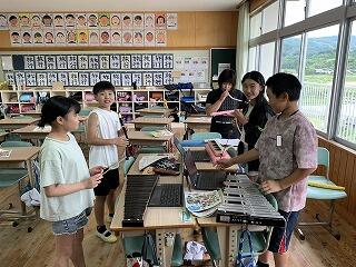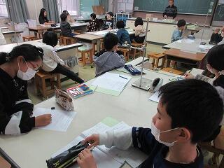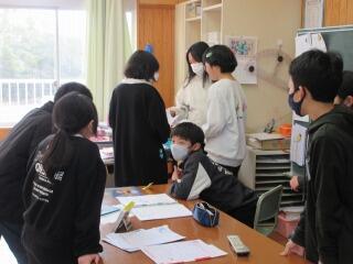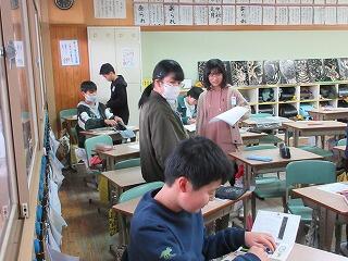 授業中には、悩んでいる児童の手助けをしたり問題の丸付けなどをしたりして子どもたちと交流しました。先輩たちが優しく教えてくれるので、3年生の子どもたちは大喜び!パソコンの扱い方もしっかり教えてもらいました。