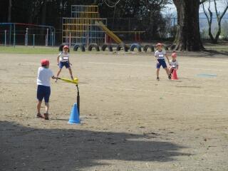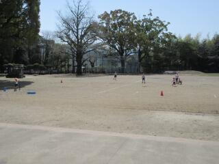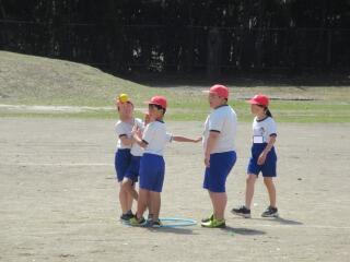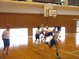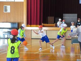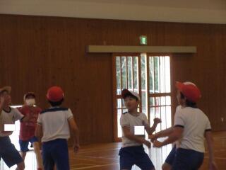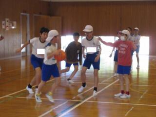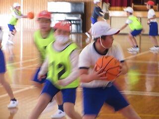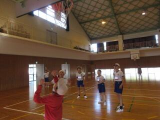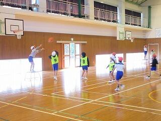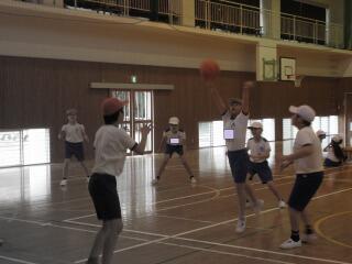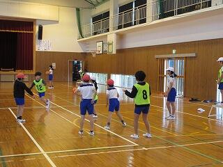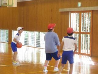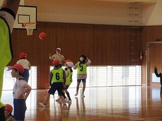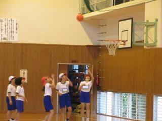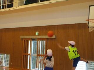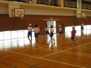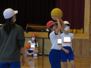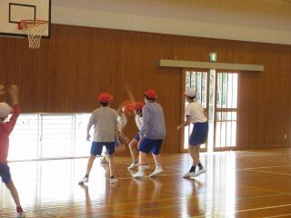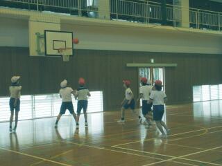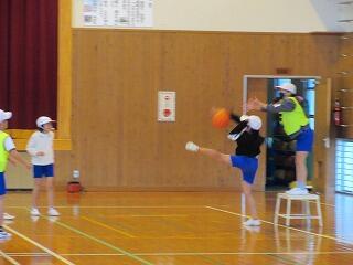 ポートボールは、高学年でのバスケットボールにつながる球技です。大きく違うところは、バスケットボールの場合、バスケットにシュートして入ったら点数になるのに対して、ポートボールは、台に乗っているゴール役の人にパス(シュート)すると点数になるところです。また、ポートボールの場合、ゴール役の人の前にガード役の人がいてシュートされたボールをカットします。パスする人は、ガード役の人の隙を見てシュートしたり、ガード役の人が届かない高さのシュートをしたりしないといけません。