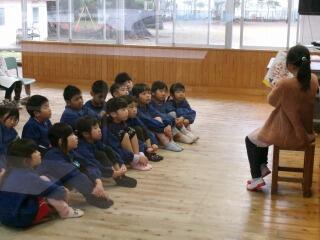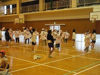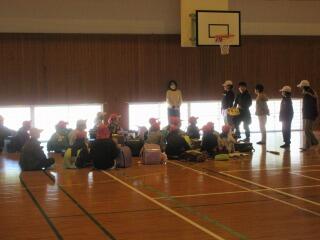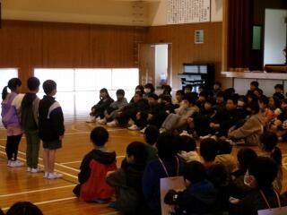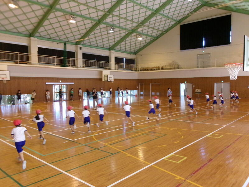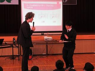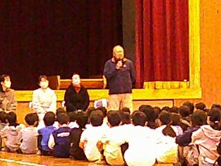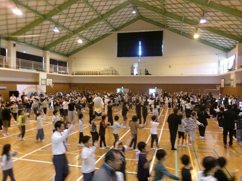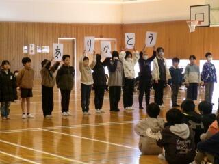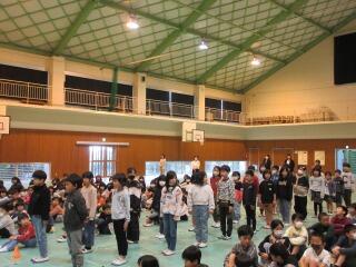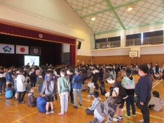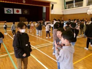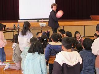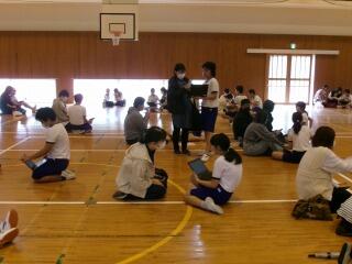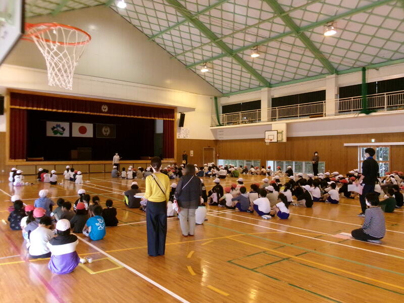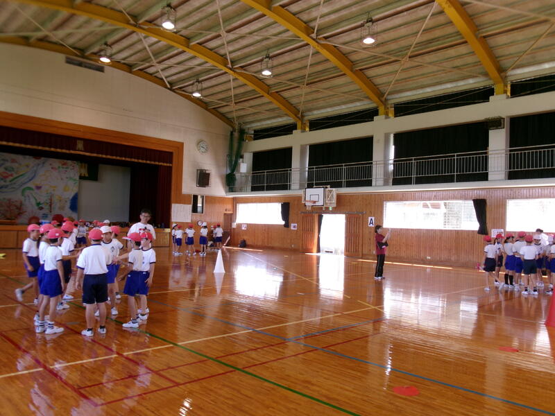 1年生の中には、外国の方と交流するのは初めてという子もいたようです。2クラスいっしょだったので、体育館で交流を行いました。