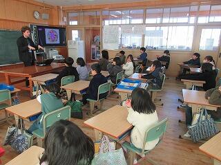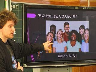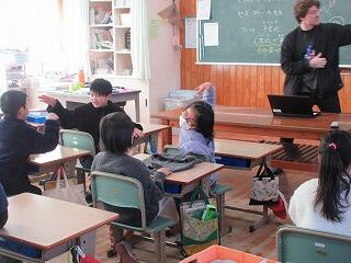 今日は、市の国際交流員のサス・スティールさんが来られて、2校時に1年、3校時に2年が楽しく交流しました。