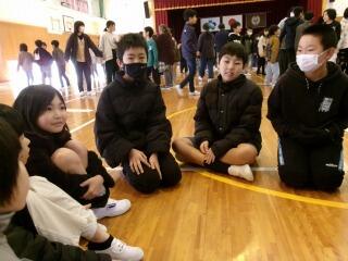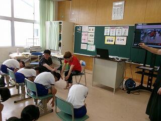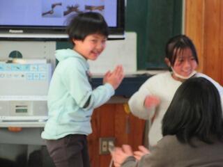 この後、アメリカでは仲がいい人同士でタッチ(プロ野球でホームランを打った選手がベンチの選手とするハイタッチなど)をよくするという話を聞き、「自分たちなりのタッチの仕方を考えよう」というゲームを行い、盛り上がりました。
