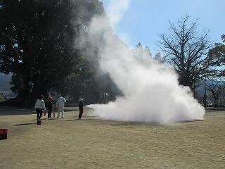 実際には、消火器を使うと辺りが見えなくなるので、使う前に避難口が背中側になるよう最初に位置取りを考える必要があります。また、火の根元に噴射することも重要だそうです。