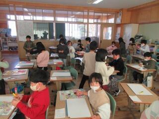 版画を刷り終えた子どもたちが、クーピーなどを使って何かを一生懸命描いています。