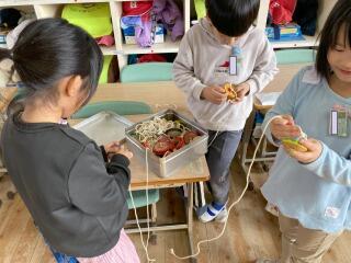 掘り出したサツマイモを両手に抱えて嬉しそうな笑顔を見せる子、皆で集めたたくさんのサツマイモの山を囲んで観察する子など、皆が収穫の喜びをかみしめている様子でした。