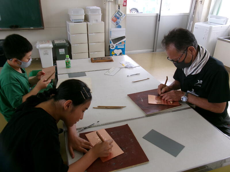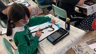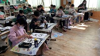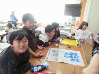 6年生の教室をのぞいてみると、版画の仕上げに入っていました。