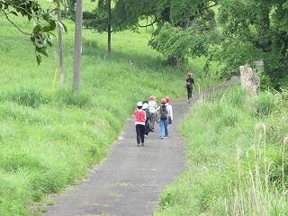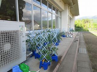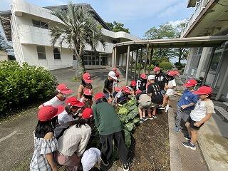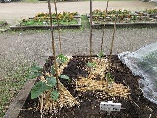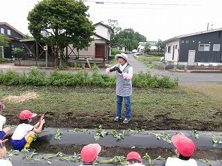 学校支援ボランティアの松山さんに教えていただきながら、学校近くの畑に、全員で100本ほどのつるを植えました。