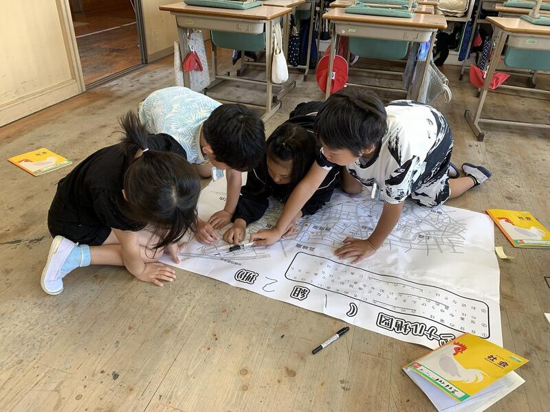 最初の単元は、校区内の様子を知る学習です。毎日の登下校や友達と遊ぶ時などの記憶をたどって、校区内の白地図に交番や学校、郵便局などの地図記号を記入していきます。