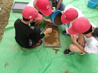 「種籾まき」とは、稲の種である種籾を土にまいて苗を育てる作業のことです。ほとんどの子どもたちにとって「種籾まき」は初めての経験です。学校支援ボランティアの松山さんご夫妻に教えていただきながら取り組んでいました。