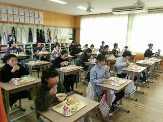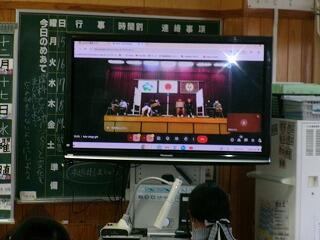 教室では、体育館のクイズの様子が音声付きで中継され、子供たちは、テレビ画面を食い入るように見つめながら食事をしていました。