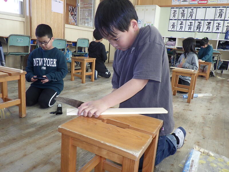 学習以前に、のこぎりを使ったことがある児童は、学級に3~4人程度。安全に使う指導を行ってから、いざ実践。