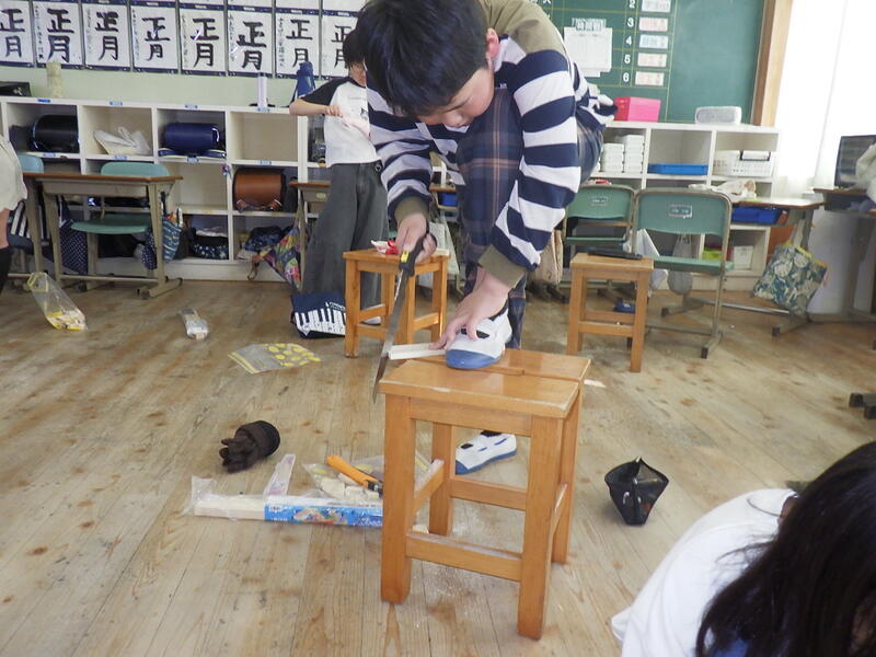 現在、3年生の図画工作科では、のこぎりを使った木工作品に取り組んでいます。