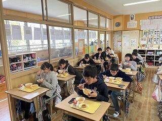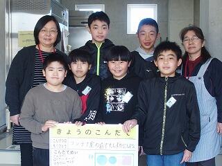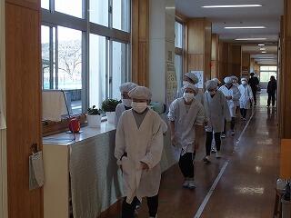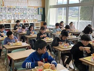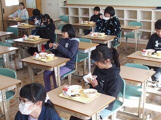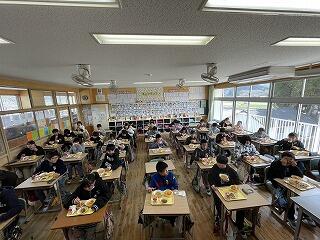 昨日の給食のメニューは中学校卒業お祝い給食で、チキンライス、ハンバーグ、野菜スープでした。6年生の子どもたちが、とてもおいしそうに食べているので写真に撮りました。